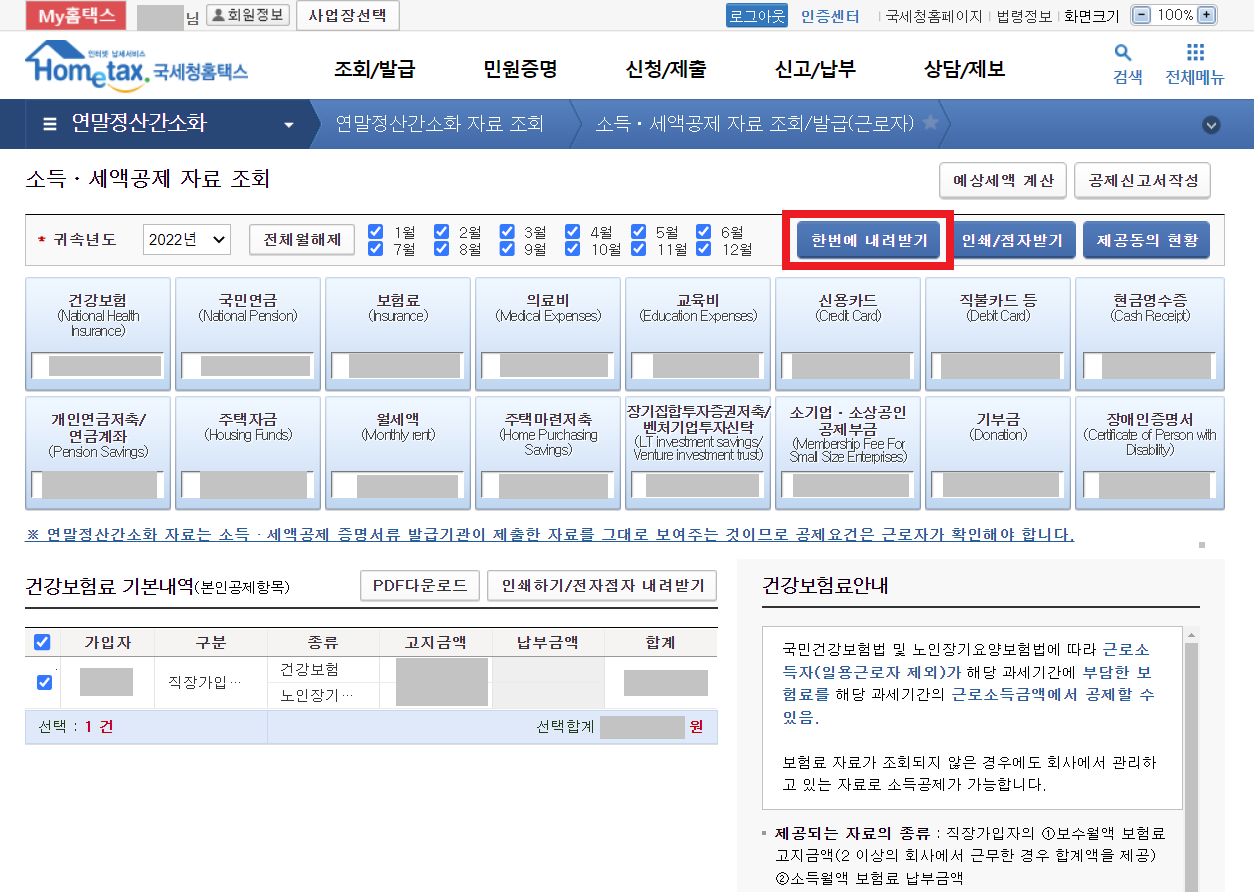 이후에 다음과 같이 [소득·세액 공제 자료 조회] 페이지에서 다음과 같이 각 항목에 대한 버튼을 클릭하면 모든 정보(상세 금액)를 확인할 수 있다. 예를 들어 2022년 귀속에 대하여 다음과 같이 초기 화면이 등장한다면, 각 버튼을 누르면 된다.