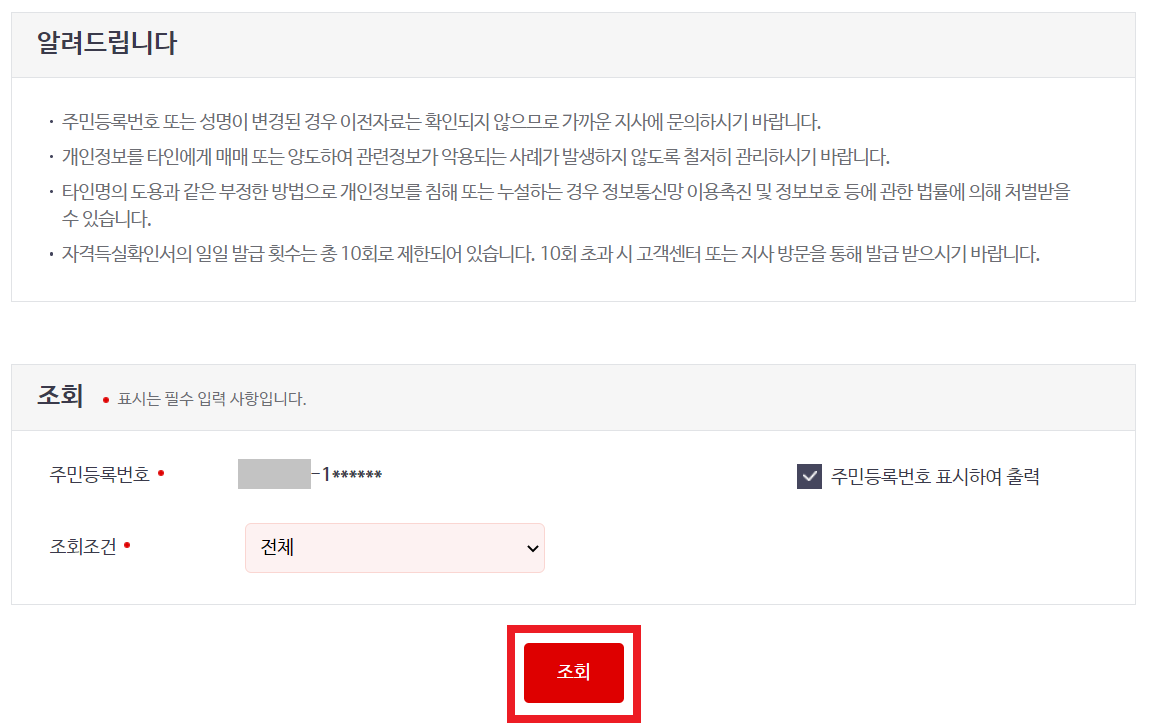 다음과 같이 구체적으로 "건강 보험 자격 득실 확인서"를 발급받기 위해 [조회]를 수행할 수 있는데, 필자는 태어난 날부터 현재까지의 모든 내역(전체)에 대하여 출력을 진행했다. 또한 다음과 같이 주민등록번호를 표시하여 출력하도록 하였다.