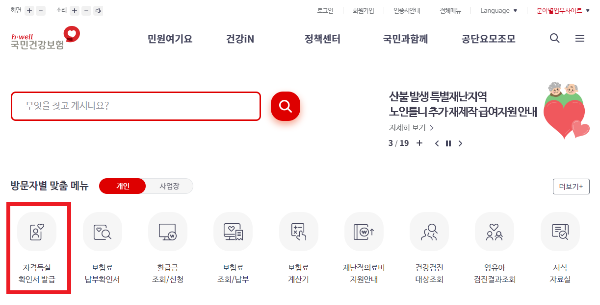 국민 건강 보험 웹 사이트에 방문한 뒤에, [자격 득실 확인서 발급] 버튼을 누르면 된다.