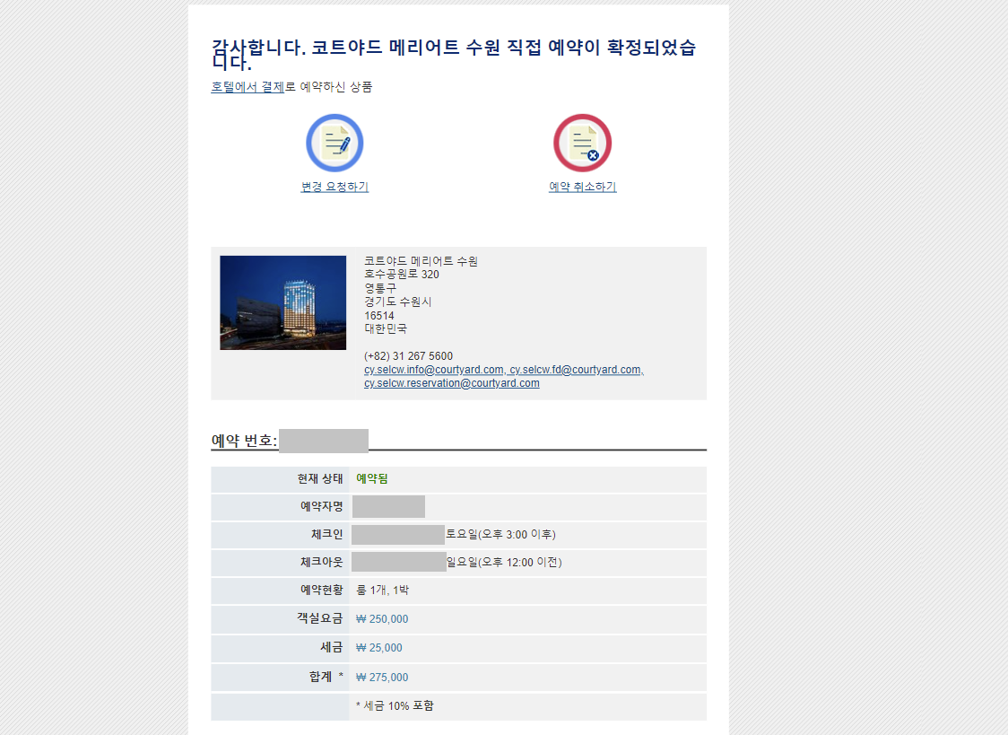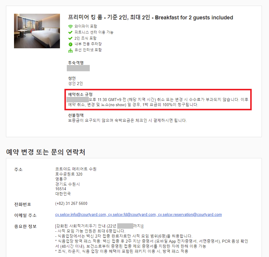 아래와 같이 다시 한번 요약된 예약 정보가 화면에 출력된다. 이때 [예약취소 규정]을 잘 확인하는 것이 좋다. 필자가 예약한 곳의 경우에는 체크인 하루 전 오후 11시 30분까지 예약을 취소하면 수수료가 부과되지 않지만, 그 이후에 취소하는 경우 100%의 비용을 지불해야 했다.