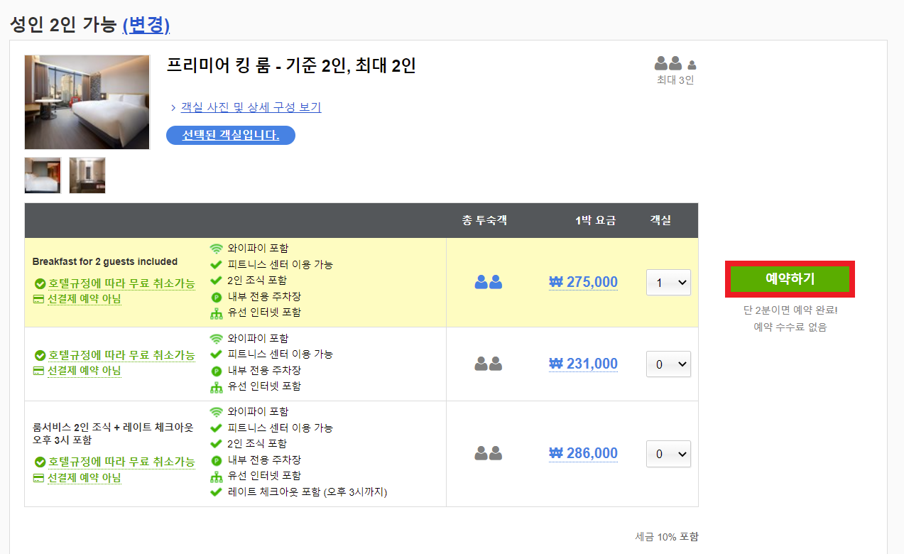 이제 네이버 호텔에서 자신이 선택한 [여행사]로 넘어간다. 필자는 호텔스컴바인을 선택했기 때문에, 호텔스컴바인 웹 사이트로 넘어갔는데, 여기에서 [예약하기]를 눌러 예약했다. 필자는 2인 투숙으로 [프리미어 킹 룸]을 선택했다. 말 그대로 킹 사이즈 침대 하나가 존재하는 것을 의미한다. 보통 연인끼리 호텔에 왔을 때 많이 선택하는 옵션이다. (필자는 눈물을 흘렸다.)
