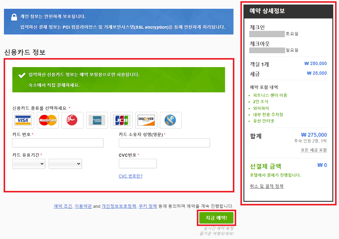 이어서 신용카드 정보를 입력해야 하는데, [선결제 예약 아님]이라고 해도 [예약 보장용]을 목적으로 신용카드 정보를 요구하는 경우가 있다. 아무튼 필자는 BC 카드로 결제를 진행했다.
