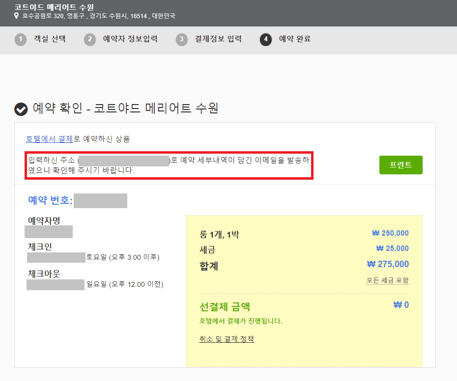 결과적으로 결제를 완료하면, 다음과 같이 호텔스컴바인에서 [예약 완료] 페이지가 나온다. 또한 자신이 예약할 때 입력했던 이메일 주소로 예약 세부 내역이 도착한다.