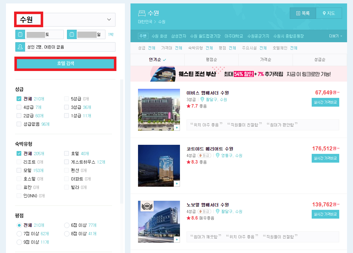 다음과 같이 호텔에 묵고자 하는 지역과 날짜를 입력한 뒤에 [호텔 검색] 버튼을 누른다. 다음과 같이 수원 지역으로 호텔을 검색할 수 있다.