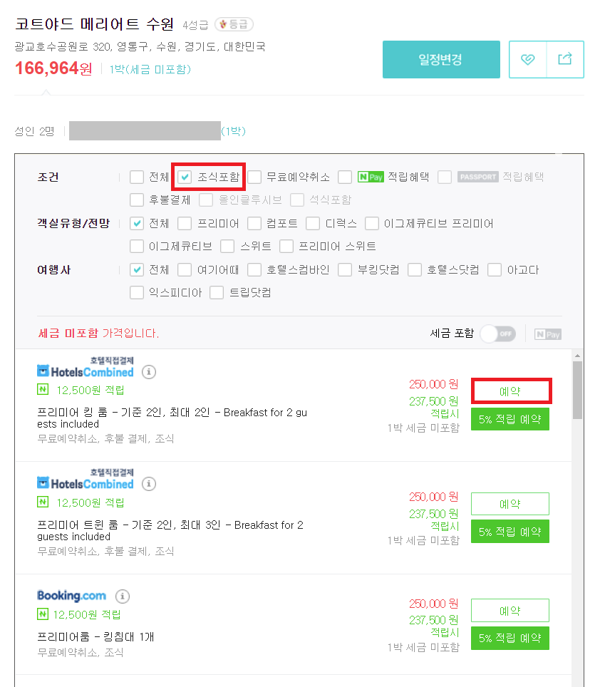 이제 구체적인 [유형]을 선택할 수 있는데, 아침을 포함한다면 [조식포함]을 선택하면 된다. 이후에 [프리미어 킹 룸]으로 가장 저렴한 가격으로 [예약]을 진행했다. 참고로 프리미어 킹 룸이란, 큰 크기의 침대 하나만 있는 것을 의미한다. 이때 [여행사]에서 [전체]를 선택하여 가장 저렴한 곳에서 결제하는 것을 추천한다.