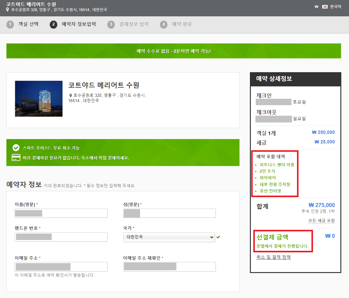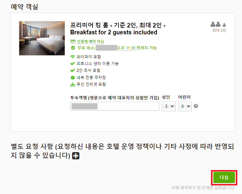 다음과 같이 예약자 정보를 입력하고, [다음]을 누른다. 이때 [예약 상세 정보]를 정확히 확인한다. 필자는 2인 조식, 주차장이 포함되어 있는지 다시 한번 확인했다. 또한 한국에 있는 호텔이지만 예약자 정보를 기입할 때는 "영문 이름"을 넣었다. 참고로 이름, 핸드폰 번호, 이메일 주소는 실제로 "호텔에 묵는 사람"의 정보를 기입해야 한다. 호텔 예약 선물을 해준다고 하면, 선물을 받는 사람의 정보를 넣어주도록 하자.