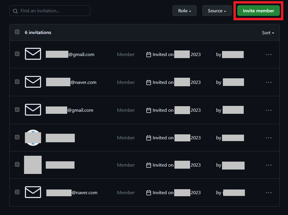 필자의 경우 다음과 같이 여러 명의 사람에 대하여 초대를 보냈고, 이러한 초대(invitation)은 해당 사람이 초대를 수락하여 해당 멤버가 조직(organization)에 추가된 경우 해당 초대장이 사라지게 된다.