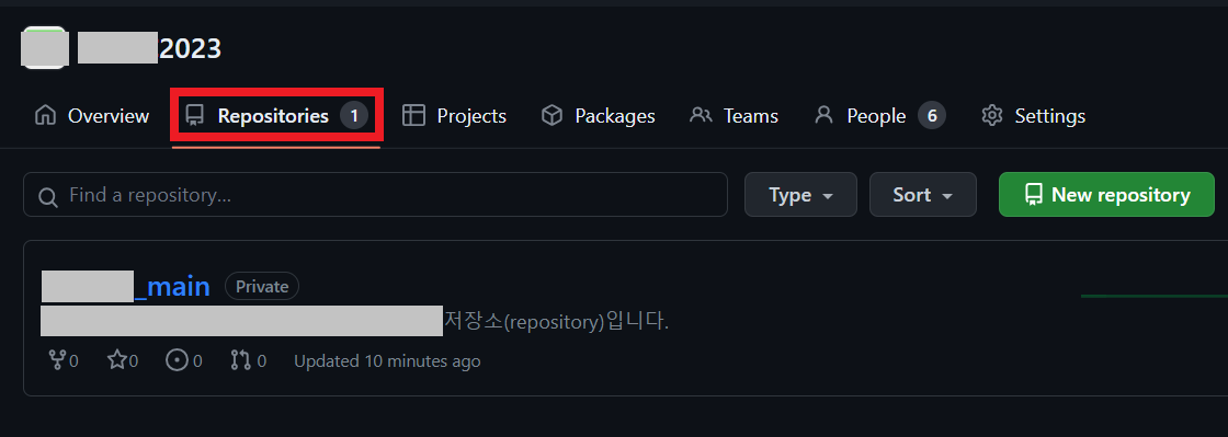 다음과 같이 저장소(repository) 탭에서 다음과 같이 저장소가 존재하는 것을 확인할 수 있다.