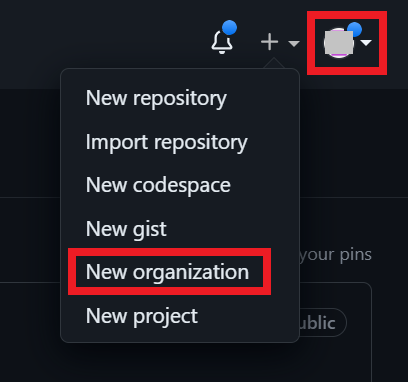 특정한 팀(team)에 속할 때, 조직(organization)을 생성하여 만들어 관리할 수 있다. 예를 들어 특정한 회사에 속하거나, 특정한 팀에 속하여 깃허브(GitHub)에 회원 가입 및 로그인한 뒤에, 다음과 같이 프로필을 클릭하고, [New organization]을 선택할 수 있다.