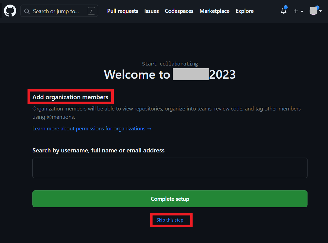 이후에 기본적으로 해당 조직(organization)에 다양한 구성원(member) 정보를 추가할 수 있다. 이때, 사용자의 이메일 혹은 GitHub 계정에 대하여 필자의 경우에는 다음과 같이 "일단 건너뛰기"를 진행한다. [Skip this step] 버튼을 클릭할 수 있다.