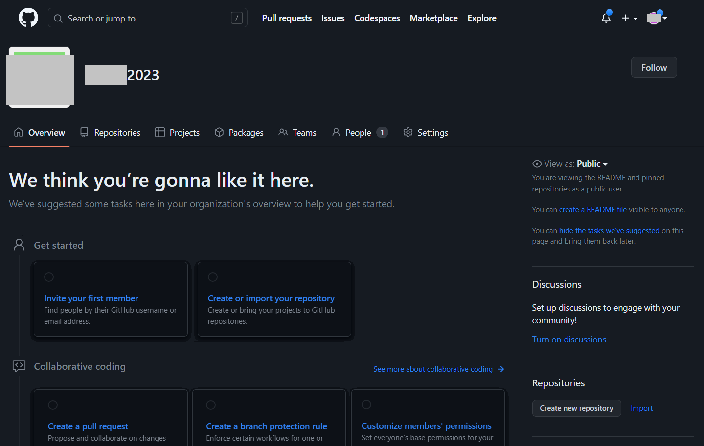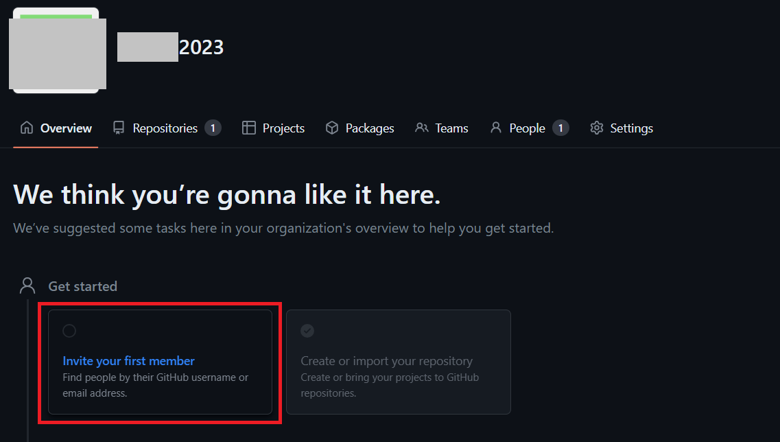 이후에 다음과 같이 [Repositories] 탭에서 저장소(repository)가 추가된 것을 확인할 수 있다. 또한, 다음과 같이 [Invite your first member] 버튼을 클릭하여, 실질적으로 필자는 같이 공부하는 팀 멤버를 추가하였다.