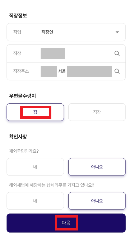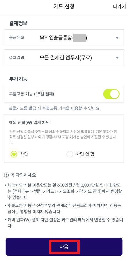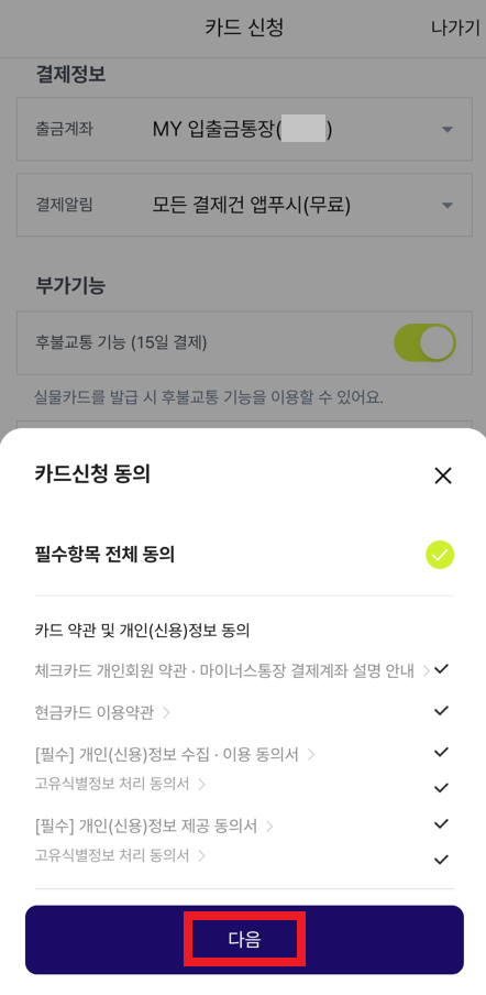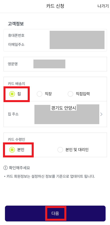 이후에 필자는 카드 신청을 했다. 카드 신청에 동의를 진행했고, 필자의 경우 "카드 배송지"를 집으로 설정했다. 이후에 "카드 수령인"으로 본인을 선택했다.