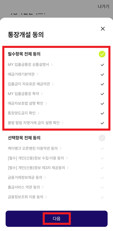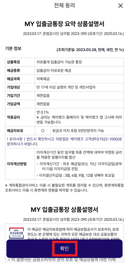 이후에 약관을 확인한다. 필자의 경우 "필수 항목"에 대해서만 동의를 했고, 오픈 뱅킹을 사용했다. 그리고 입출금 통장에 대한 내용이 요약되어 담겨 있는 상품 설명서 내용을 확인한 뒤에 [확인] 버튼을 눌렀다.