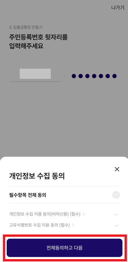 케이 뱅크 앱을 실행한 뒤에, 다음과 같이 "입출금 통장" 개설을 위한 페이지에 접속한다. 필자의 경우 가장 먼저 주민등록번호를 입력한 뒤에 약관에 동의했다.