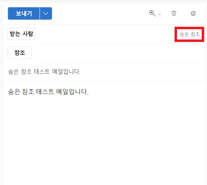 다음과 같이 [받는 사람]에는 자신의 이메일 주소를 넣은 뒤에, 실제로 메일을 받을 사람의 주소를 "숨은 참조"에 기입하도록 한다. 이때, "숨은 참조"에 들어갈 내용으로 받을 사람들의 이메일 주소를 모두 넣으면 된다.