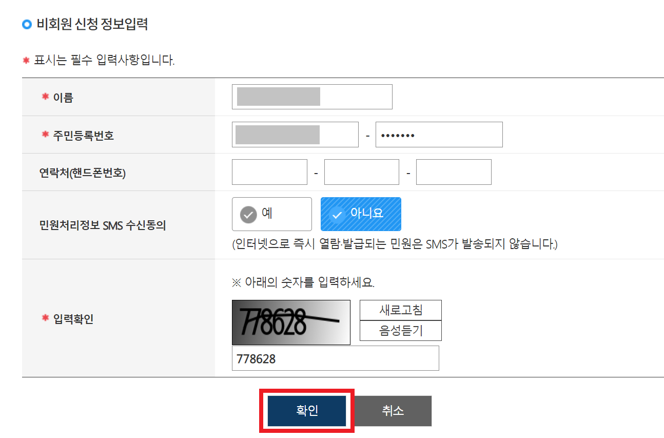 이후에 다음과 같이 본인의 개인 정보(이름, 주민등록번호 등)를 입력한 뒤에 [확인] 버튼을 눌러서 실질적으로 본인 인증을 진행할 수 있다.