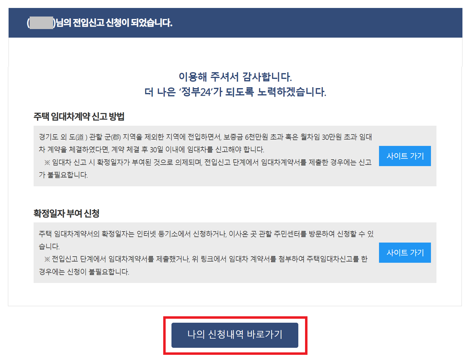 결과적으로 다음과 같이 "전입신고 신청"이 완료된 것을 확인할 수 있다. 신청 완료 이후에는 [나의 신청내역 바로가기] 페이지를 클릭하면, 해당 페이지로 내용을 확인할 수 있다.