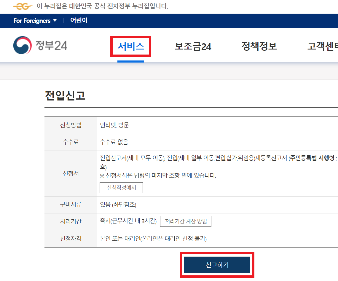[정부 24] 웹 사이트에 접속한 뒤에 "전입 신고" 페이지에 들어가서 [신고하기]를 클릭하면 된다.