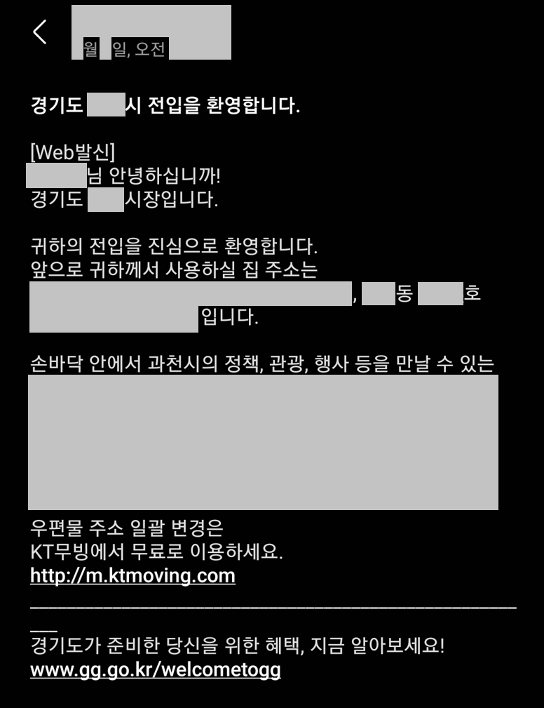 전입 신고 이후에는 "○○시장"으로부터 ○○시 전입을 환영한다는 문자 메시지가 도착하는 것을 확인할 수 있다.