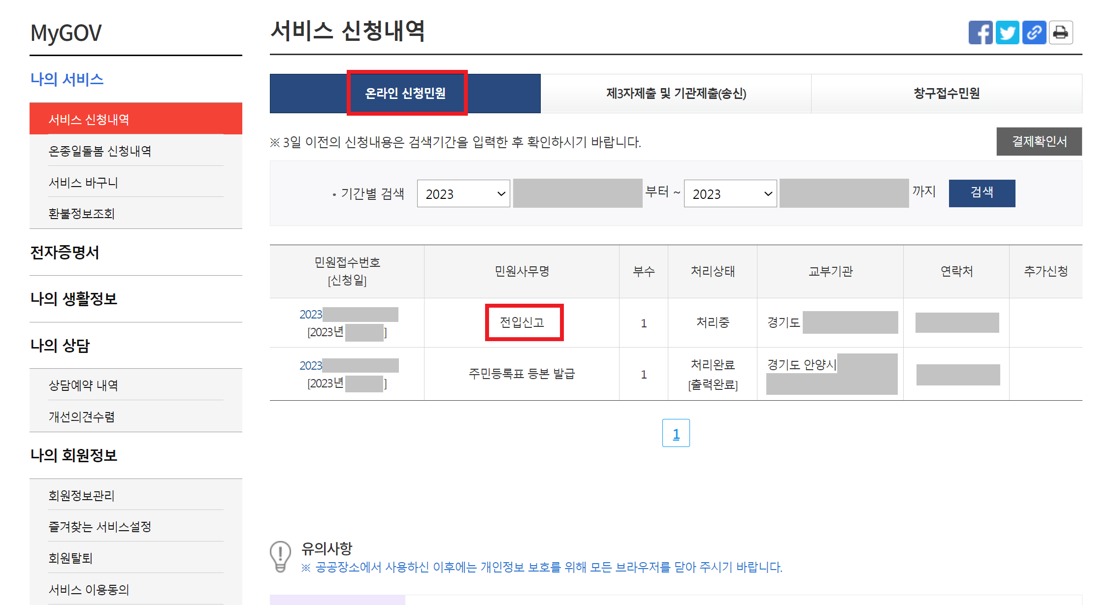 "서비스 신청내역" 페이지로 이동하면, 다음과 같이 이전에 신청했던 서비스 내역이 나오는 것을 확인할 수 있다. 실질적으로 다음과 같이 전입 신고 신청 내역을 확인할 수 있다.