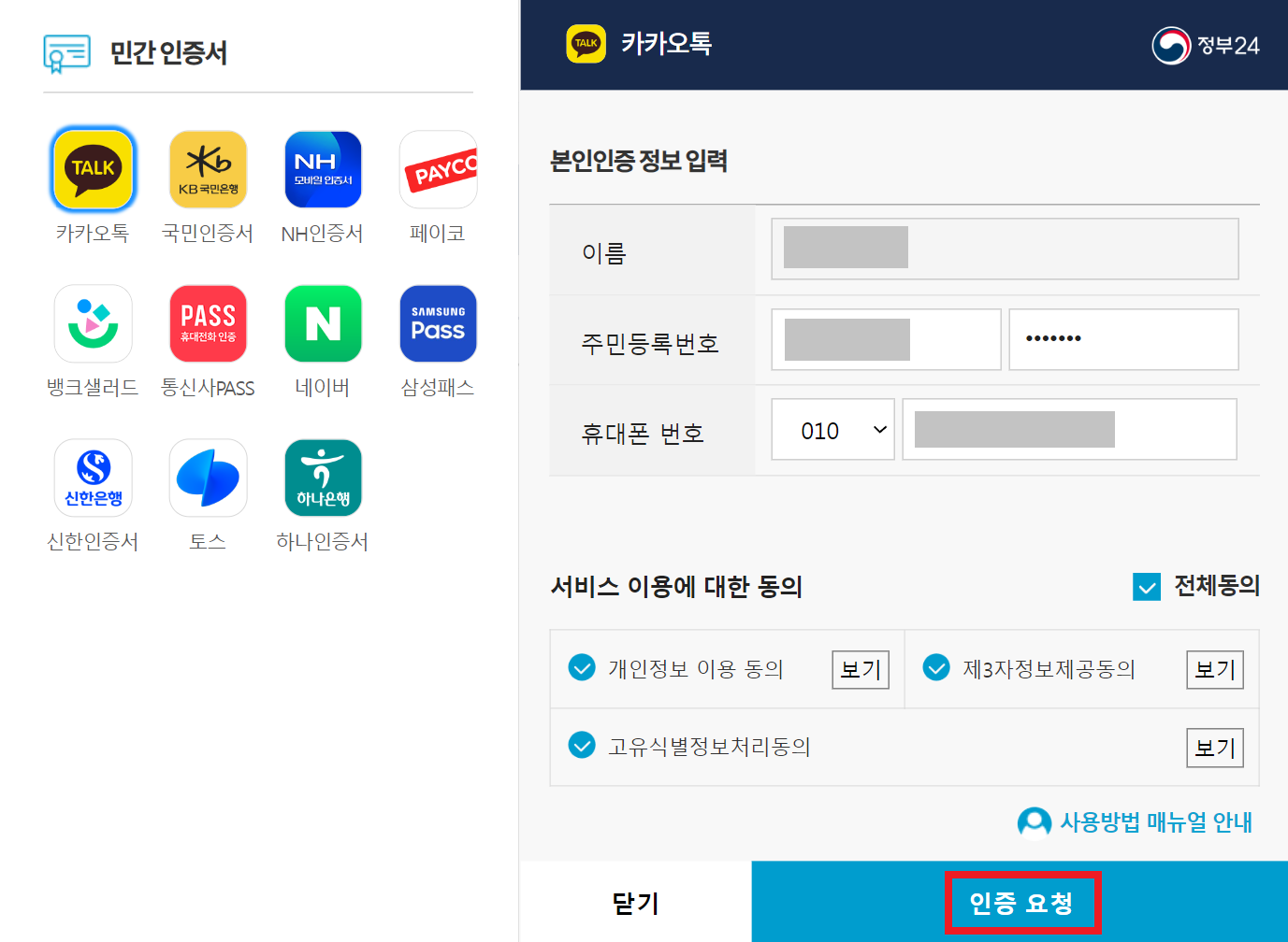 기본적으로 [민간 인증서]를 이용하여 인증할 수 있는데, 요즘에는 공인인증서(공동인증서) 없이 간단히 인증을 진행할 수 있다. 필자의 경우 카카오톡 인증서를 이용했다.