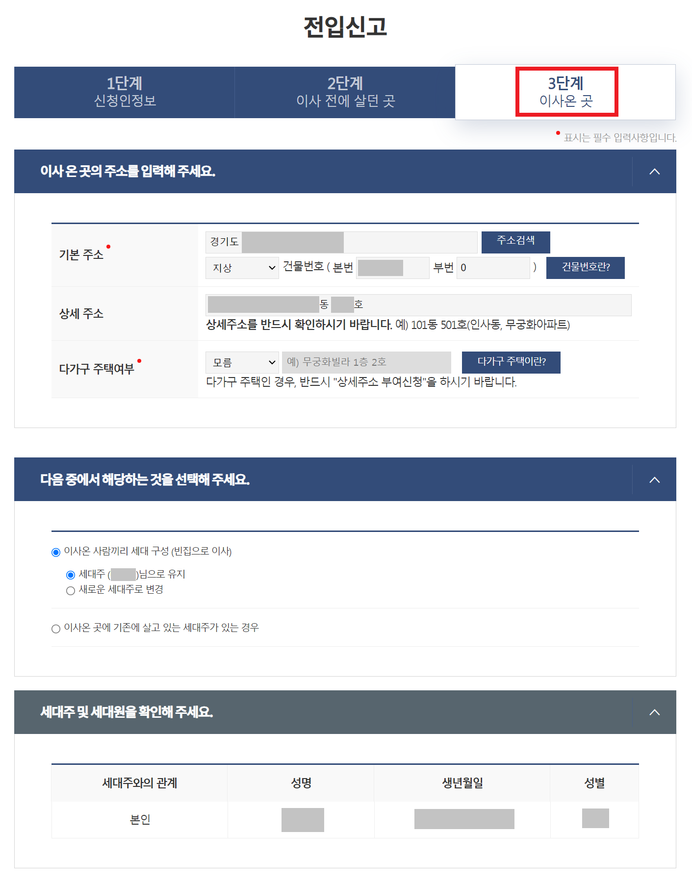 이후에 "새롭게 이사온 곳"에 대한 정보를 기입한다. 말 그대로 본인이 새롭게 가게 되는 집 주소를 기입하면 된다. 필자는 다음과 같이 주소를 기입했다.