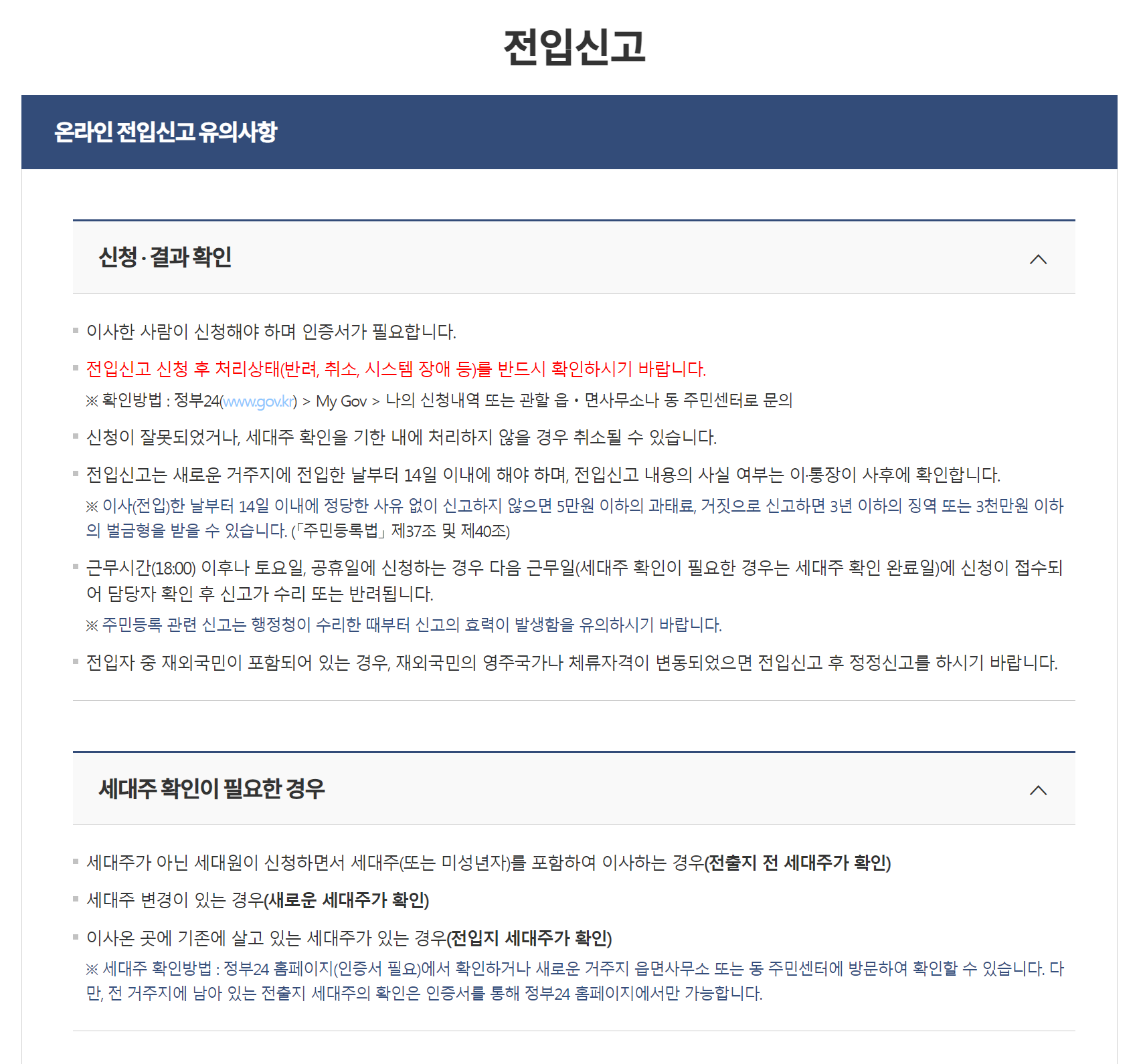 이후에 다음과 같은 "온라인 전입신고 유의사항"을 확인할 수 있다. 여기에도 나와 있듯이, 내가 어떤 집으로 이사를 갔다면 전입 신고는 14일 이내에 해야한다. 실질적으로는 이사를 간 날 저녁에 즉시 전입 신고를 하는 것을 강력히 추천한다. 필자의 경우 이사간 날에 인터넷 연결(인터넷 이전 설치)가 진행되도록 한 뒤에, 바로 인터넷으로 "전입 신고"를 진행했다.