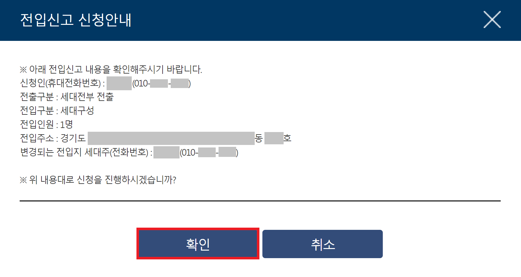 결과적으로 [민원 신청하기] 버튼을 클릭하면, 다음과 같이 "전입신고 신청 안내" 메시지를 확인할 수 있다. 그래서 다음과 가티 최종적으로 이사갈 곳(전입할 곳)에 대하여 정확한 내용을 확인할 수 있다. 이때, 구체적으로 전입 주소(동과 호수까지) 정확히 기입되어 있는지 확인하도록 하자. 최종적으로 [확인] 버튼을 누르면 된다. 필자의 경우 혼자 살고 있는 상태에서, 집을 새로 구해서 혼자 이사를 가기 때문에 본인이 세대주로 "세대 전부 전출", 그리고 전입 인원은 "1명"으로 설정한 것을 확인할 수 있다.