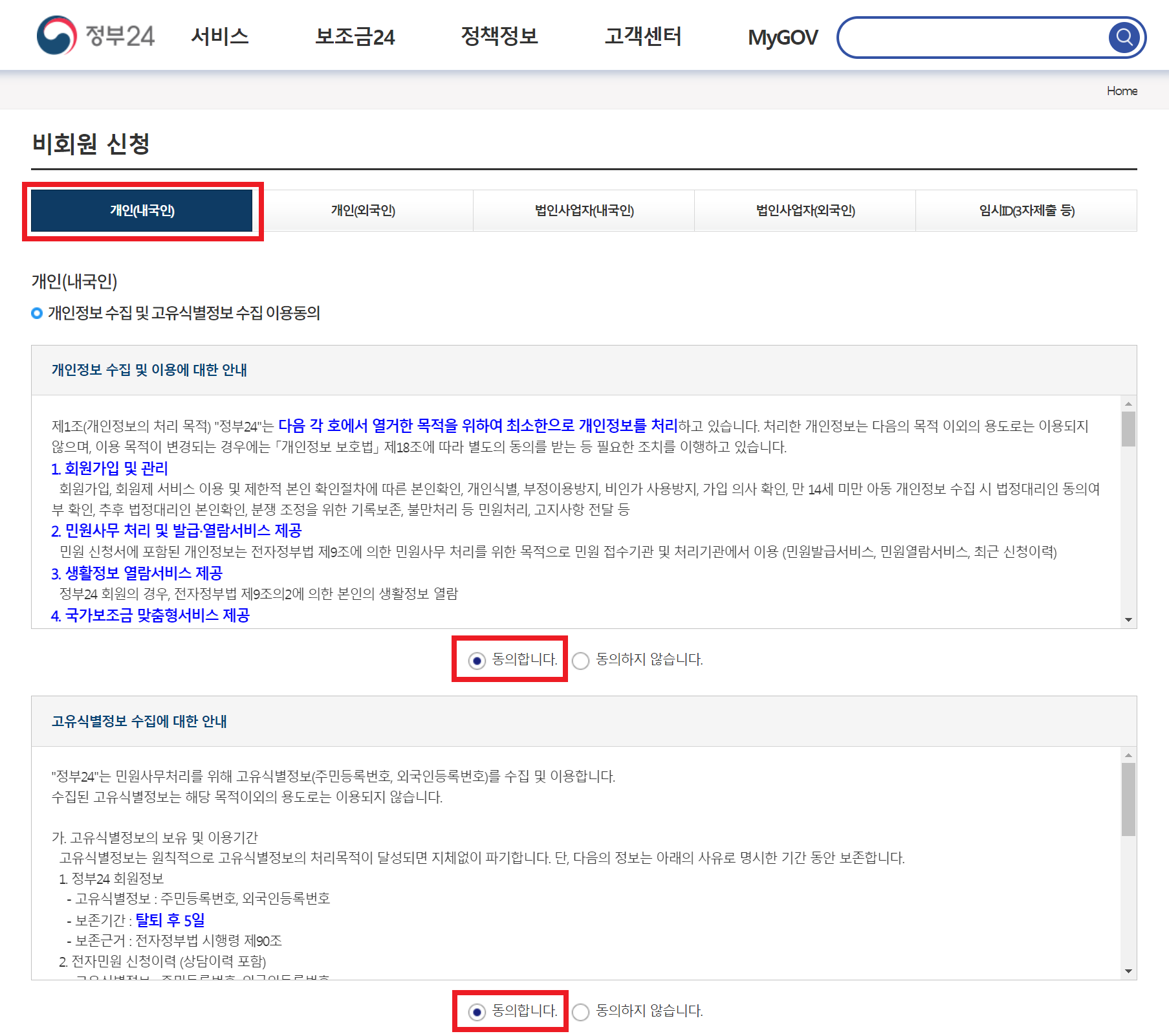 또한, 최근에는 공동인증서(공인인증서) 없이도 간단하게 민간 인증서(카카오톡 인증서) 등을 이용하여 로그인하여 본인 인증(신원 확인)을 진행할 수 있다. 다음과 같이 [비회원 진행하기]를 클릭하여 진행하자.