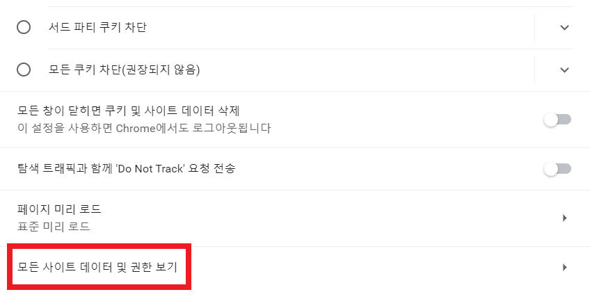 이후에 다음과 같이 [설정] - [개인 정보 보호 및 보안] - [쿠키 및 기타 사이트 데이터] 페이지에 접근하여 내용을 확인할 수 있다.