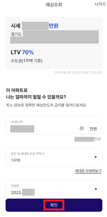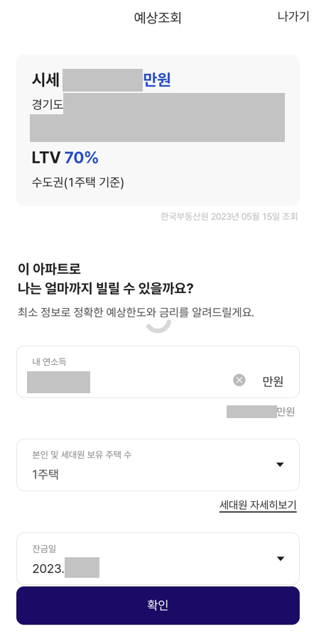 필자는 다음과 같이 매수가 예정된(구매할) 아파트의 주소를 입력했고, 그러면 자동으로 해당 아파트의 "시세"가 확인된다. 해당 시세 정보를 확인하고, 얼마나 대출이 나오는지 확인할 수 있다.