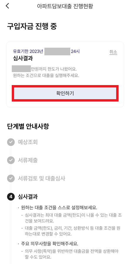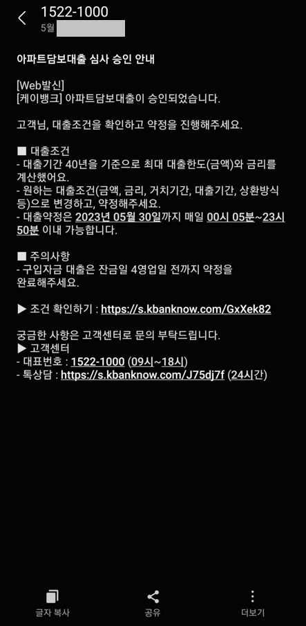 결과적으로 다음과 같이 "아파트 담보 대출 심사 승인"에 대한 내용이 문자로 도착하는 것을 확인할 수 있었다. 이후에 케이뱅크 앱에 접속하면, 심사 결과로 얼마까지 구체적으로 대출이 가능한지에 대한 내용이 나왔고, 이제 [확인하기] 버튼을 눌러서 최종적으로 심사 결과를 보고 대출 계약을 진행할 수 있게 된 것이다.