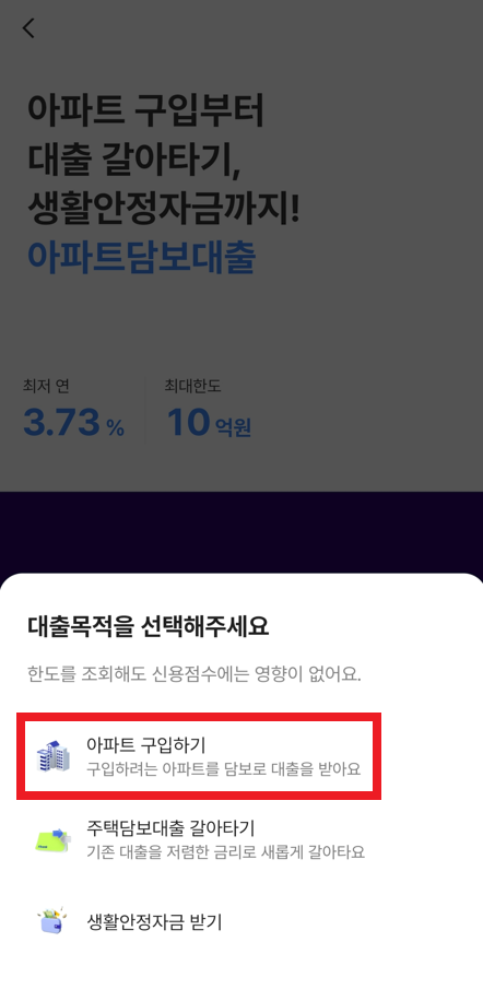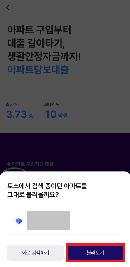 필자는 다음과 같이 [케이 뱅크]에서 [아파트 담보 대출]을 선택했다. 여기에서 [아파트 구입하기]를 클릭하였다. 필자의 경우 토스(Toss) 앱에서 연동되어 케이 뱅크로 넘어왔다. 그래서 "토스에서 검색 중이던 아파트를 그대로 불러오기"를 확인하여 진행했다. 그래서 구체적으로 다음과 같이 [조회하기]를 누른 뒤에 토스에서 검색 중이던 아파트를 그대로 불러와 내용을 확인할 수 있다.