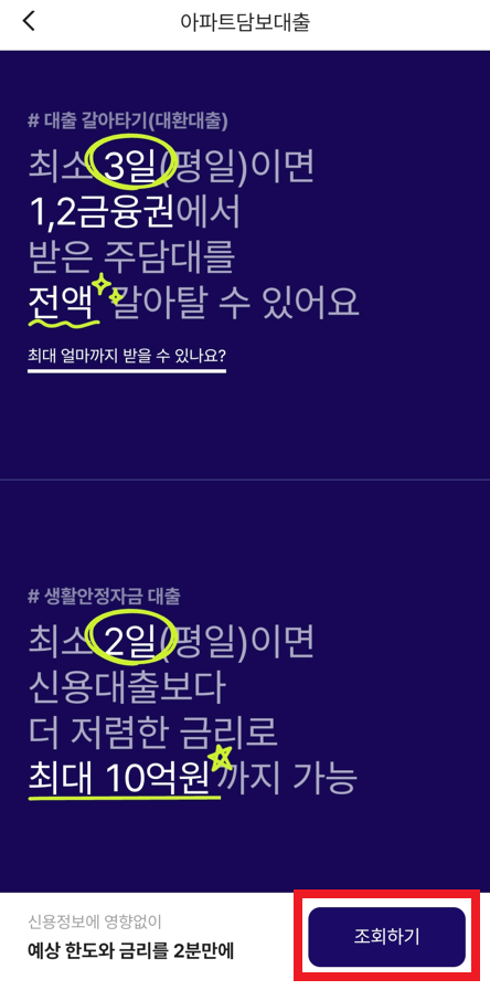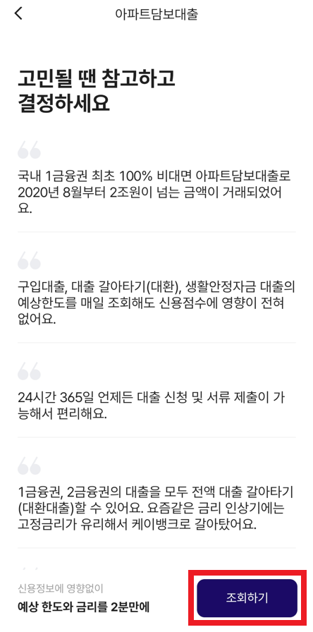 필자의 경우 케이 뱅크에서 대출 신청을 하고, 심사 결과까지 확인할 수 있었는데, 내용을 전체 사진과 함께 정리해 보았다. 케이뱅크(K Bank)를 설치한 뒤에, 다음과 같이 "아파트 담보 대출"을 클릭하여 [조회하기]를 눌러 진행할 수 있다.