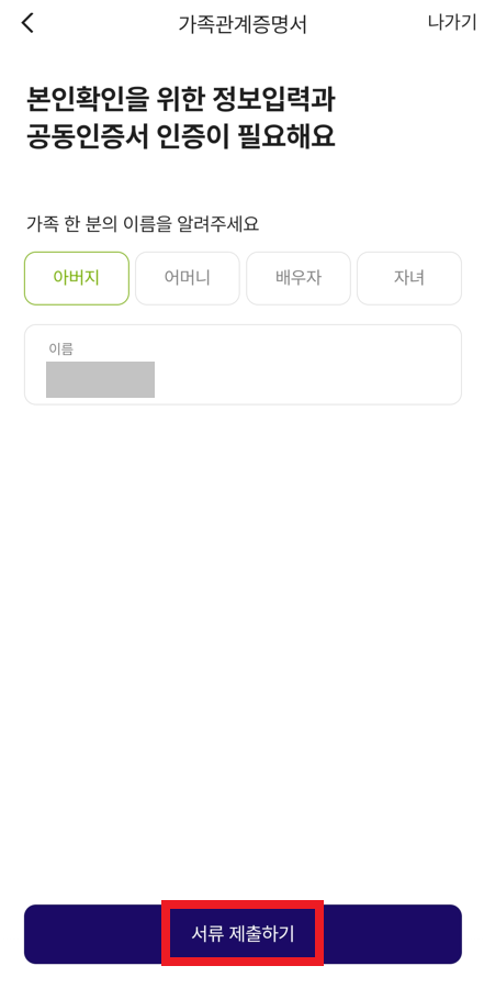 이후에 다음과 같이 "가족 관계 증명서"를 제출하기 위하여 가족 정보를 입력한 뒤에, "공동인증서(공인인증서)"를 활용한 인증을 통한 자동 제출까지 완료한다. 결과적으로 다음과 같이 전체 준비된 서류 목록을 확인할 수 있다.