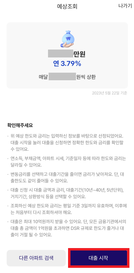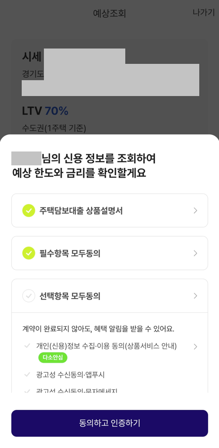 필자는 다음과 같이 신용 정보를 조회하도록 하였고, 최종적으로 "예상 한도와 금리"를 확인할 수 있다. 다만, 해당 예상 한도는 스스로가 입력한 "연소득"을 기반으로 산정되기 때문에, 해당 연소득을 실제로 인정받을 수 있는지의 여부는 은행 심사과에서 결정하는 것이다.