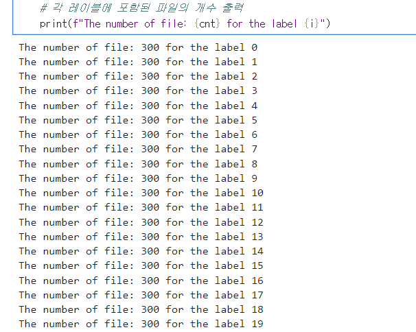 print(f"The number of file: {cnt} for the label {i}")