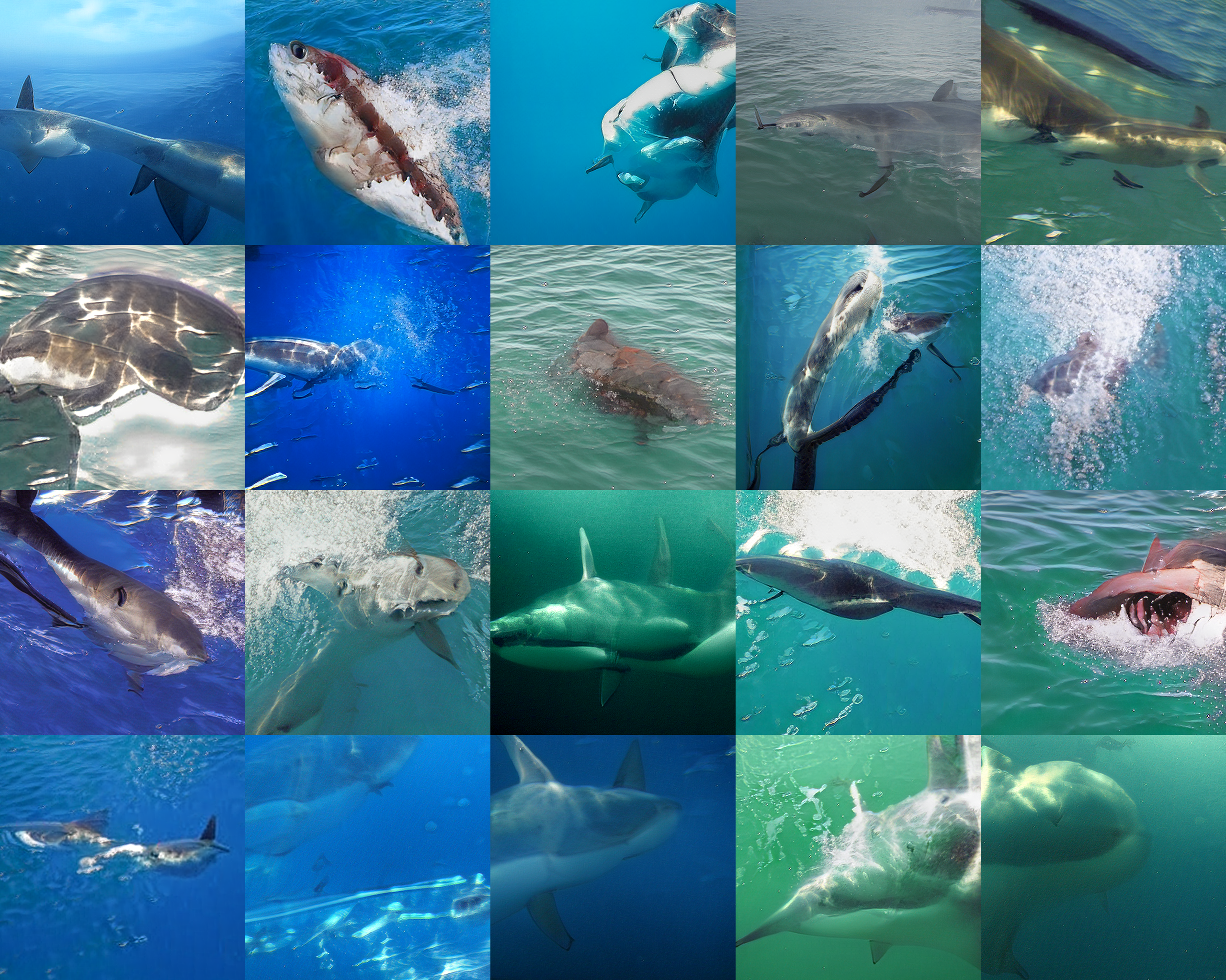 예를 들어 class 2에 대하여 만들어진 격자 이미지는 다음과 같다. 참고로 ImageNet-1k에서 두 번째 클래스는 백상아리(white shark) 클래스에 해당한다. 20장의 이미지가 차곡차곡 잘 담긴 것을 확인할 수 있다. 아래의 이미지들은 전부 다 생성된 이미지이며, 실제로 존재하지 않는 동물 사진이다. 만들어진 것들이다. 심지어 위에 보이는 코드처럼 truncation trick을 위한 파라미터의 값을 1.0으로 설정했으니, truncation 적용을 하지 않고 만들어진 이미지인데도 우수하다.