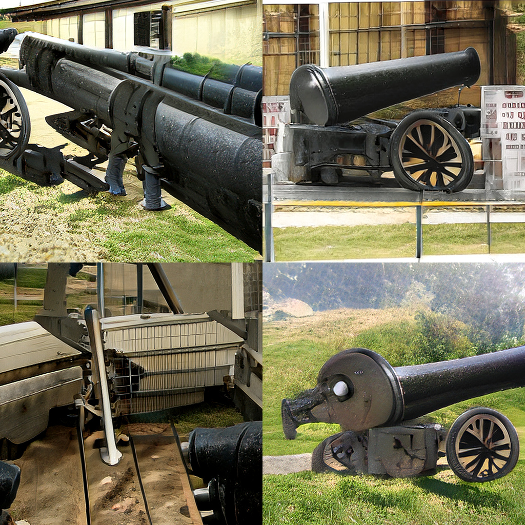 결과적으로 만들어진 이미지를 확인해 보자. 다음과 같이 4개의 생성된 이미지가 격자 형태로 만들어져 출력된 것을 확인할 수 있다. 조금 어색해 보이는 부분들이 있지만, 상당히 대포(cannon)의 형상을 잘 보이고 있다.