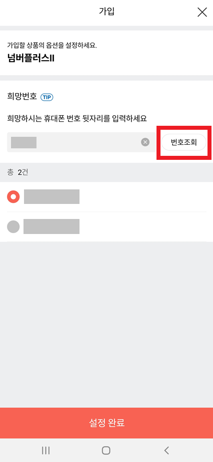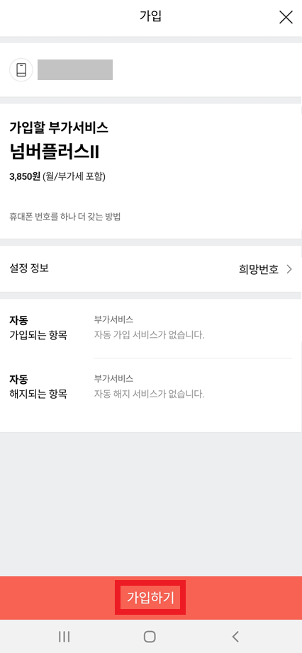 이후에 자신이 희망하는 휴대폰 번호 뒷자리를 입력한 뒤에 [번호조회]를 클릭한다. 이후에 [가입하기] 버튼을 누른다. 기본적으로 추가 요금은 한 달에 3,850원 수준으로 매우 낮다.
