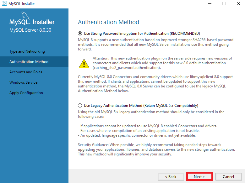 이후에 인증(authentication)을 위한 비밀번호 암호화 방식을 선택하는데, 개선된 SHA-256 방식을 사용하도록 설정한다.