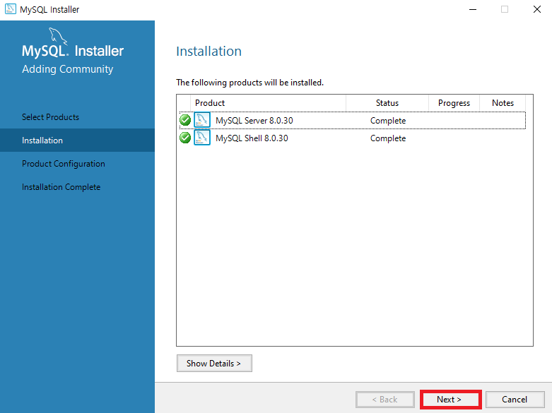 MySQL 설치 프로그램(Installer)에서는 다음과 같이 원하는 제품을 선택할 수 있다. 필자는 ① MySQL 서버와 ② MySQL 쉘(Shell)을 설치했다.