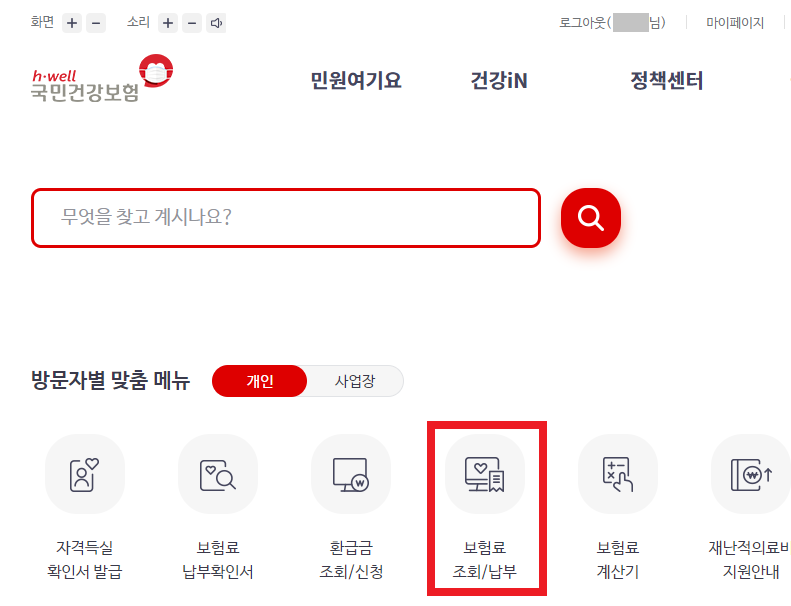 건강보험료를 조회하는 방법은 간단하다. 건강보험공단 웹 사이트에 방문하여 로그인을 한 뒤에, [보험료 조회/납부] 페이지에 접속한다.