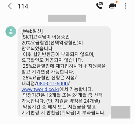 휴대폰 약정이 끝나게 되면 다음과 같은 문자를 받게 된다. 만약 휴대폰 기기를 바꾸고 싶은 생각이 없다면, 단순히 약정 기간이 끝났으므로 25% 요금할인을 받고 재가입을 하면 된다. 당연히 그냥 쓰는 것보다야 요금 할인을 받는게 낫다. 물론 몇 년 동안 계속 요금제를 써야 한다. 일반적으로 통신사와 상관 없이, 대체로 25% 정도의 요금 할인이 진행된다.