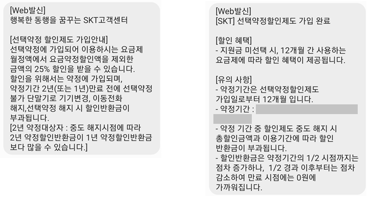 일반적으로 약정이 끝나기 ① 2달 전, ② 1달 전, ③ 끝난 직후에 각각 114로부터 문자가 도착한다. (약정 종료에 대한 알림이다.) 앞서 말했듯이 약정이 끝난 뒤에 휴대폰 기기를 바꾸지 않고, 요금 할인도 받지 않고 그대로 사용할 수도 있다. 만약에 약정이 끝난 이후에도 재약정을 하지 않고, 가만히 있는 경우에는 25% 할인이 적용되지 않는다. 나중에 재약정을 한다고 하더라도, 가만히 있었던 기간 동안에 대해서는 소급이 불가능하다는 말을 SKT 상담사에게 들었다.