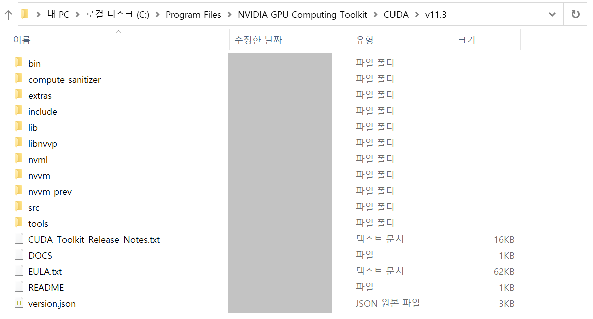 앞서 설치했던 CUDA Toolkit의 설치 경로에 가보면 전체 폴더가 다음과 같이 구성되어 있는 것을 확인할 수 있다. 이제 cuDNN 폴더에 존재하는 bin, include, lib 폴더를 다음의 경로에 옮겨주면 된다. 필자는 마치 폴더를 덮어쓰듯이 그대로 옮겨주었다.