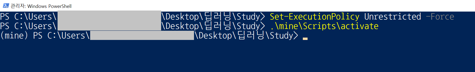 이후에 다음과 같이 가상환경에 접속한다. 참고로 윈도우 운영체제에서 이를 정상적으로 수행하기 위해서는 명령 프롬프트 대신에 Windows Powershell을 관리자 권한으로 실행해야 할 수도 있다. 또한 이 경우에 콘솔 창에 다음과 같은 명령어를 추가적으로 입력해야 한다.