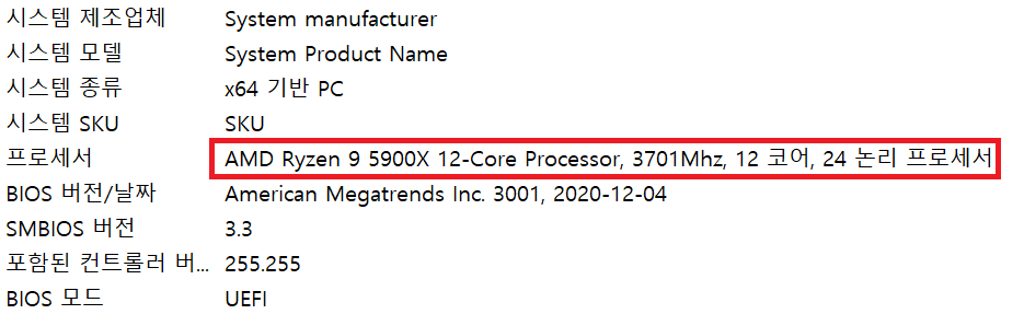 이후에 [시스템 정보]를 실행하면 다음과 같은 화면이 나온다. 필자는 AMD 라이젠9-4세대 5900X를 사용하고 있다. 다음과 같이 [프로세스]란에 자신이 사용 중인 CPU 정보가 등장하는 것을 알 수 있다.