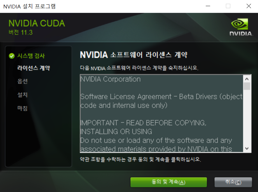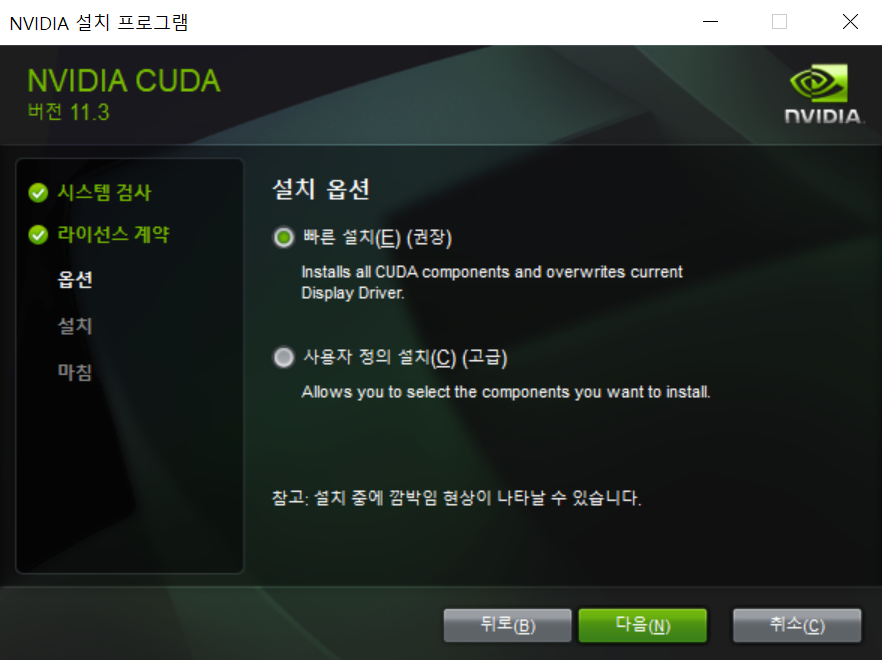이후에 필자는 다음과 같이 라이센스에 동의한 뒤에 [빠른 설치]를 선택하여 설치를 진행했다.