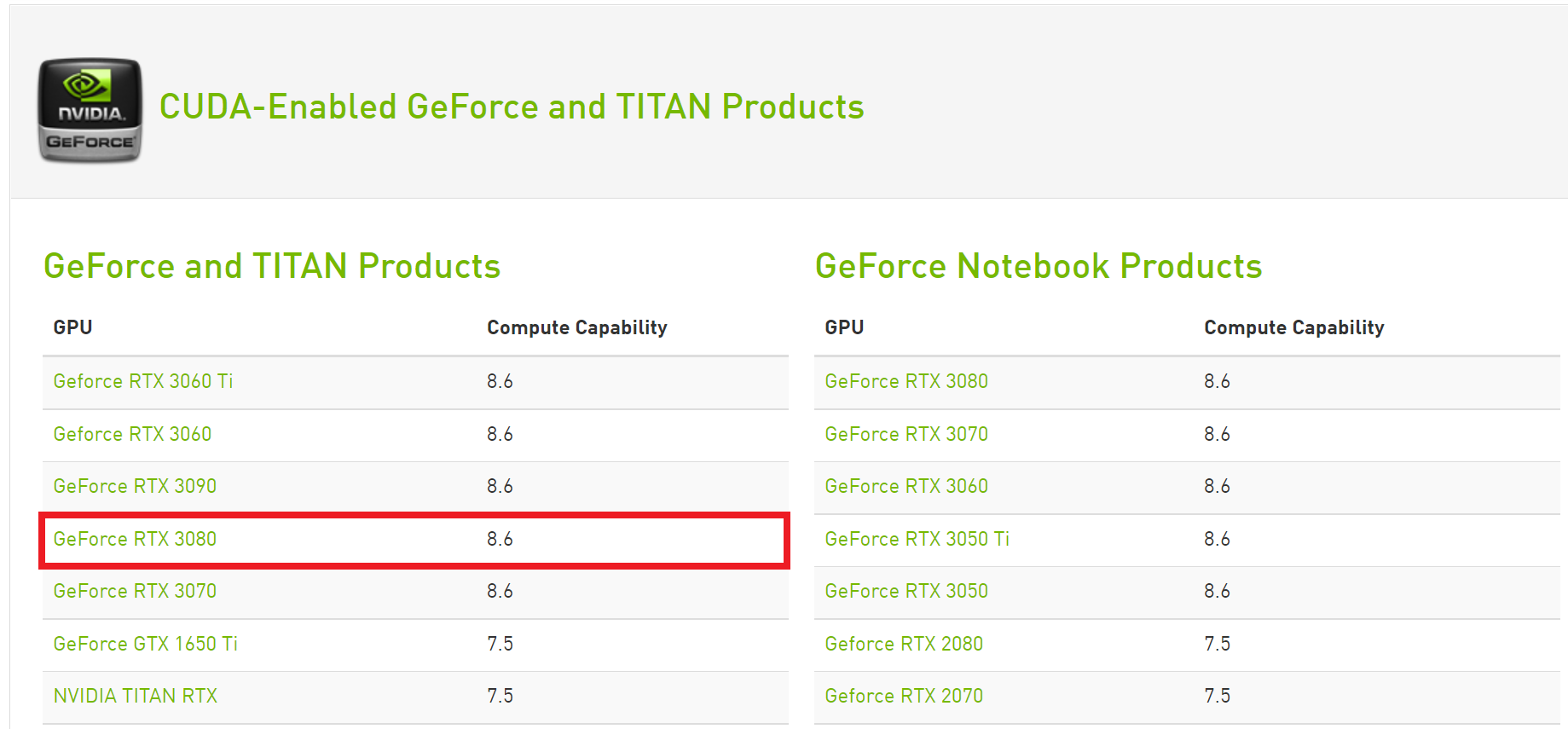 홈페이지에 접속한 뒤에 자신의 GPU 버전을 확인한다. 필자는 GeForce RTX 3080 Ti를 사용하고 있는데, 다음과 같이 8.6 Compute Capability에 해당하는 것을 확인할 수 있다.